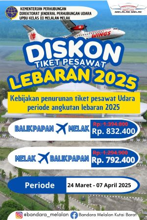 SENDAWAR – Menjelang Hari Raya Idul Fitri 1446 Hijriah, penerbangan di UPBU Kelas III Melalan Kutai Barat (Kubar) menurunkan tarif pesawat jurusan Melak – Balikpapan. Penurunan tarif ini mulai 24 Maret hingga 7 April 2025. Sementara 31 Maret hingga tanggal 2 April tidak ada penerbangan.